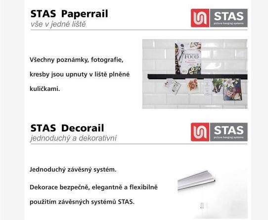 -> STAS Decor-rail je jednoduchý závěsný systém, který může být kompletně schován po ozdobnou římsu nebo rám. Zavěšte Vaše dekorace bezpěčně, elegantně a flexibilně použitím závěsných systémů STAS!